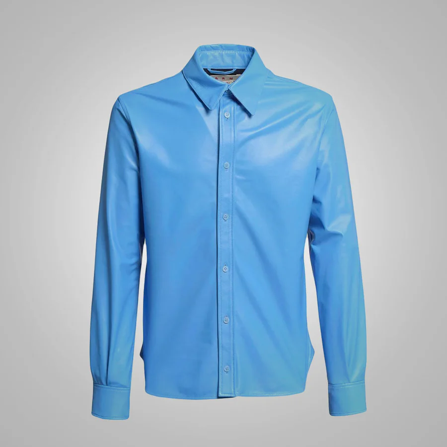 Sky Blue Lambskin Leather Shirt Men